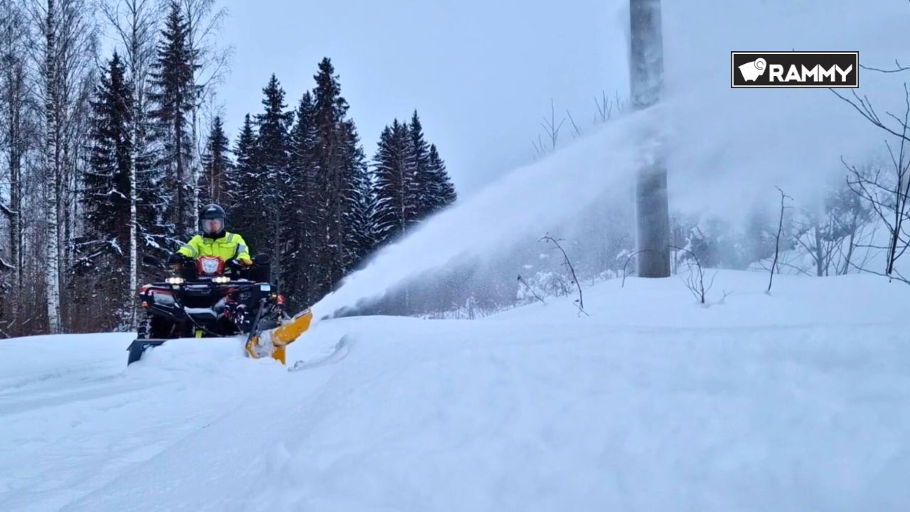 snöslunga som ska monteras på plog Rammy Thrower Plow ATV är en kombination av plog och snöslunga som monteras på en ATV för effektiv och flexibel snöröjning. Snövallar är inte längre ett problem eftersom Rammy Thrower Plow slungar iväg snön över vägbanken. Thrower Plow lyfts upp med hjälp av ATV:ns vinsch för smidig körning av ATV:n på olika terränger. Plogen kan användas med eller utan snöslungan. Plow W165 ATV PRO + Snow Thrower ST30 ATV = Thrower Plow ATV Arbetsbredd 1,18 m (med Plow W165 ATV PRO) Vikt Plow W165 ATV PRO + ST 30 ATV = 120 kg. Motor Briggs&Stratton 1450 SnowSeries. Volym 306cm3, vridmoment 20Nm. Tankvolym 3,0l. Manuell/elstart (230V). Inmatare 1-stegs, 4 blad. Gummibladen dämpar stötar och riktar in snön i enheten. 4 st matarblad i stål. Inmatarens Ø 300mm. Växellåda 2 kilremmar, remspännhjul. Kastlängd Upp till 15m. Fjärrkontroll Elektronisk fjärrkontroll. Strömförsörjning från snöslungans motor. – Huvudströmbrytare PÅ/AV – Vridning av utkastaren 160 grader HÖGER/VÄNSTER Bränsleförbrukning 1-2 L/h Montering på ATV Front- eller mittmonterad justerbar tillbehörsram (tillval). Om du redan äger en Rammy Snowblower, gräsklippare eller klippare, kan dess justerbara tillbehörsram användas. Monteringsfästen med hål på plogbladet för ATV, hål Ø10mm, eller 16-19-20mm låshake. Justerbar bredd på monteringsfästet 240-500mm (yttermått), justerbar längd 500-830mm (frontmontering)/750-1250mm (centermontering). Lyft/nedsänkning Med hjälp av ATV:ns vinsch. En motvikt rekommenderas för ATV:n för att balansera tyngden framtill. Skidor/glidyta Nötningshållfast specialstål. Standardutrustning – Verktyg för snöborttagning – Dragstart – Elstart 230V – Elektronisk fjärrkontroll – Monteringselement för plogen – Fjärrkontrollsfästen för styret på ATV:n – Adapter för plogblad – Förvarings- och underhållsstöd Kapacitet: 750 m3/h vid torr snö.